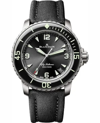 Blancpain Fifty Fathoms Automatic Brand New Luxury Men's Watch. Features a 42mm diameter brushed titanium case and round shape measuring 14.30mm thick. Equipped with a scratch-resistant sapphire crystal lens. Comes complete with an original uni-directional screw-down bezel (titanium insert) and titanium tang clasp bracelet strap combination. Dial is black featuring luminous silver tone hands, stick/Arabic numeral hour markers, minute markers around the outer rim for easy reading, and date display positioned between 4 o'clock and 5 o'clock. Powered by an automatic movement, Caliber 1315 with a power reserve of approximately 120 hours (8 days). Functions include Hours, Minutes, Seconds, Date, and Power Reserve indicator. Water resistant up to 300 meters or 990 feet for diving conditions. Comes with original Blancpain box, papers, guarantee card, and strap folding clasp closure mechanism. Includes an additional reference designation as model number 501012B30B52A.