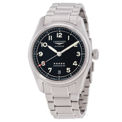 Silver-tone stainless steel case and bracelet, fixed silver-tone stainless steel bezel, black dial with silver-tone hands and Arabic numeral hour markers, minute markers around the outer rim, analog dial type with luminescent for night readability, date display at 6 o'clock position, automatic movement Calibre L888.4 based on ETA A31.L11 with 21 jewels, beats per hour: 25200 vph, power reserve approximately 64 hours, scratch resistant sapphire crystal, solid case back, round case shape size 37 mm, fold over clasp equipped with safety release mechanism, water resistance up to 100 meters / 330 feet depth. Complete set includes original box, international warranty card and manual.