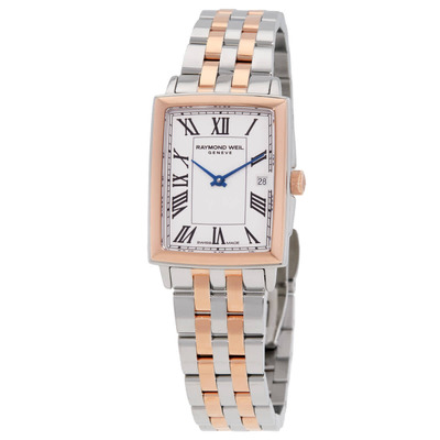 Silver-tone stainless steel rectangle case. Two-tone (silver-tone and rose gold-tone) stainless steel bracelet. Fixed rose gold-tone stainless steel bezel. Analog white dial with blue hands, Roman numeral hour markers, minute markers around the outer rim. Date display at 3 o'clock position. Quartz movement. Scratch resistant sapphire crystal. Pull / push crown. Solid case back. Case size: 22.6 x 28.1mm, thickness: 6.4 mm. Band width: 15 mm. Water resistant to 50 meters / 165 feet. Functions include hour, minute, second and date display.