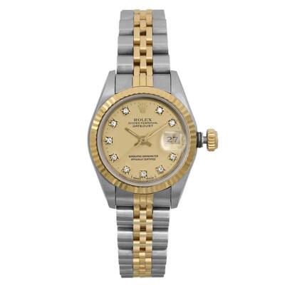 Silver-tone stainless steel case. Two-tone (silver-tone and yellow gold-tone) stainless steel jubilee bracelet incorporating an 18kt yellow gold element. Fixed yellow gold-tone bezel. Champagne dial displaying analog time with a date window at the 3 o'clock position, featuring diamond hour markers and minute markers around the outer rim. Yellow gold-tone hands indicating hours, minutes, and seconds. Powered by Rolex Calibre 2135 Automatic movement containing 29 jewels beating at 28800 vph (approx. 4Hz). Power reserve approximately 42 hours. Scratch resistant sapphire crystal. Screw-down crown ending in a yellow gold-tone cap. Solid case back. Round shape, size 26mm, thickness 11mm. Two-row fold over clasp with safety release for the strap/band measuring 10mm width and total length of 6 inches (approx. 15 cm). Water resistant up to 100 meters / 330 feet.
