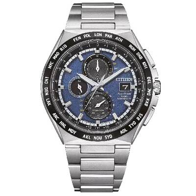 Citizen Caliber H800 Eco-Drive movement. Analog dial with blue color, silver-tone hands and index hour markers including minute markers on the outer rim. Date display at 3 o'clock position. Radio-controlled function ensures accuracy via Citizen technology. Sapphire crystal offers scratch resistance. Silver-tone super titanium case (including bracelet) features a black titanium bezel and round shape measuring 43 mm in diameter with 10 mm thickness. Band width is 13 mm. Deployment clasp with push button release mechanism included. Water resistant to 100 meters / 330 feet depth. Functions include chronograph (60 second, 24 hour, 1/10th of a second sub-dials), date, hour, minute, and second displays, as well as stopwatch capability.
