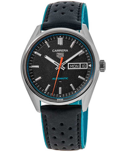 Authentic Tag Heuer Carrera Day-Date. Model number WDA2110.FC6614. Automatic mechanical movement, TH31-02 engine with 80 hours power reserve. Brushed and polished stainless steel case. Fixed bezel. Black dial featuring luminous silver tone stick hour markers with minute markers around the outer rim. Day-date indication at the 3 o'clock position. Polished stainless steel folding clasp. Round shape measuring 41mm in diameter and 12.60mm thick. Scratch-resistant sapphire crystal. Water resistance up to 100 meters (approx. 330 feet). Includes a see-through caseback. WatchMaxx two-year warranty included. Day of the week and date display in the 3 o'clock area.