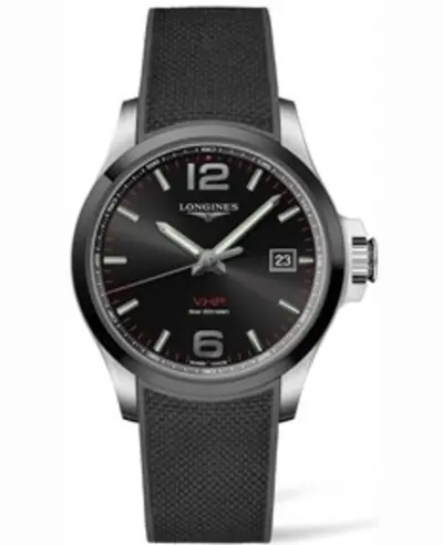 Authentic Longines Conquest V.H.P., black dial, black rubber strap men's watch model L3.729.4.56.9 (also known as L37294569). Features stainless steel and ceramic case with folding clasp closure. Equipped with a quartz movement powered by Longines Caliber L288 engine. Includes date, hour, minute, second, and battery end of life indicator functions. The black dial displays silver tone luminous hands and Arabic numeral/index hour markers along with minute markers around the outer rim. Secured view through scratch-resistant sapphire crystal in a round case measuring 43mm diameter. This watch is solid case back and features water resistance up to 50 meters (165 feet) depth, protected by a 2 year WatchMaxx warranty.