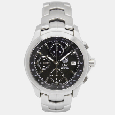 A classic black dial Tag Heuer men's watch with a stainless steel case and bracelet from the Link series. Features an automatic movement equipped with date functionality. Designed for everyday wear.
