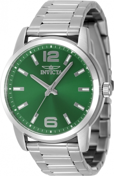 Silver-tone stainless steel case and bracelet, fixed silver-tone bezel, green dial with luminous silver-tone hands and index-Arabic numeral hour markers, minute markers on the outer rim, analog dial type, Hattori Caliber PC21 quartz movement (Japan Movt), scratch resistant mineral crystal, push/pull crown, solid case back, round shape 43mm diameter, 22mm band width, 7 inch band length, folding clasp closure, water resistant to 50 meters / 165 feet. Functions: hour, minute, second. Part of the Celestial Series.