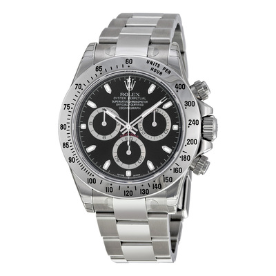 Pre-Owned Swiss Made Men's Analog Chronograph with Silver Tone Hands and Stick Hour Markers, Black Dial. Features include: Fixed stainless steel bezel with engraved tachymeter markings; Screw down crown; Scratch resistant sapphire crystal; Oyster clasp bracelet made from stainless steel (case also); 72-hour automatic movement power reserve; Three sub-dials displaying seconds, minutes and hours respectively; Minute markers around the outer rim. Water resistant at 100 meters / 330 feet.