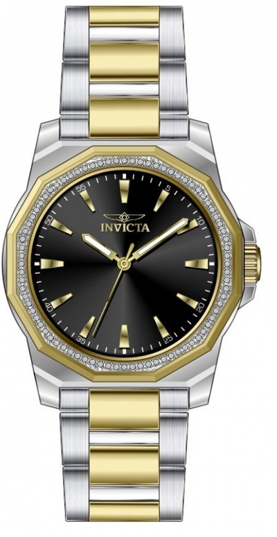 Silver-tone and gold stainless steel case; two-tone (gold and silver-tone) stainless steel bracelet with fold over push button clasp. Fixed white crystal bezel. Analog black dial featuring gold-tone luminous hands, index hour markers, outer minute markers. TMI Caliber PC21J quartz movement. Scratch resistant mineral crystal. Pull/push crown. Solid case back. Dodecagon case shape measuring 34 mm diameter and 9.2 mm thickness. Band width: 18 mm; band length approximately 6.75 inches (adjustable). Water resistant to 30 meters / 100 feet.