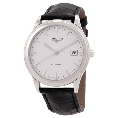 The Longines Flagship Automatic White Dial Mens Watch features a white dial with silver-tone hands and index hour markers, an analog display, fixed stainless steel bezel, sapphire crystal for scratch resistance, automatic movement (Calibre L888 based on ETA A31.L11) containing 21 jewels operating at 25200 vph. Includes date function visible at the 3 o'clock position. Equipped with a silver-tone stainless steel round case measuring 38.5 mm diameter and 8 mm thick, fitted with a black alligator/crocodile leather strap secured by a tang buckle clasp. Water resistant to 30 meters (99 feet).
