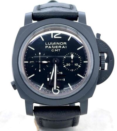 A pre-owned luxury mens chronograph watch. Features a black ceramic case, black leather strap with ceramic tang clasp, fixed black ceramic bezel. The black dial has luminous analog hands and index hour markers (Arabic numerals at 6 and 12 o'clock), minute track around the outer rim, linear power reserve indicator at 6 o'clock, and three sub-dials: one for 24-hour/60-second, one for 30-minute elapsed time. Powered by Panerai Calibre P.2004 Hand-Wind movement with column wheel (based on P.2002), containing 29 jewels, composed of 321 parts; beats at 28800 vph and offers a power reserve indicator for approximately 72 hours. Equipped with scratch-resistant sapphire crystal glass, screw-down crown, transparent case back, cushion-shaped case measuring 44mm diameter by 17.5mm thickness. Band width is 22.9mm and length adjusts to 9 inches (approx. 23 cm). Water resistant up to 100 meters / 330 feet depth. Includes second time zone function, hour, minute indicators; small seconds sub-dial for precise timing. Swiss Made label.