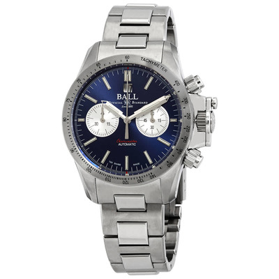 Analog blue dial, luminous silver-tone hands and index hour markers. Minute outer ring minute markers. Fixed stainless steel tachymeter bezel. Date display at the 12 o'clock position. Chronograph function with two sub-dials: one for seconds (0-60), one for minutes (0-45). Powered by Ball calibre RR140-C automatic movement featuring a 38-hour power reserve. Scratch resistant sapphire crystal glass. Stainless steel case equipped with screw-down crown and solid case back. Includes fold over clasp with safety release mechanism. Water resistant to 100 meters / 330 feet depth. Functions include chronograph, date, hour, minute, second, tachymeter. Dress watch style from the Engineer Hydrocarbon Racer collection. Swiss Made label.