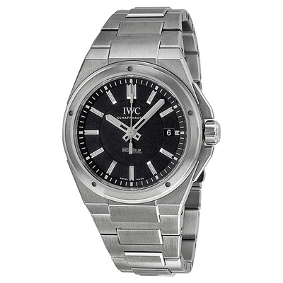IWC Ingenieur Black Dial Stainless Steel Automatic Mens IW32323902, Pre-owned with fixed bezel, black dial featuring silver-tone hands and index hour markers, analog display showing hours, minutes, seconds, date at 3 o'clock position. Includes screw down crown, sapphire crystal, solid case back, round 40mm diameter case, deployment push-button clasp, automatic movement rated for up to 42 hours power reserve, water resistant to 120m.