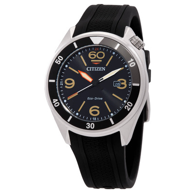 Silver-tone stainless steel case, black rubber strap with buckle clasp. Features a black bezel and black dial marked with silver-tone hands and index-Arabic numeral hour markers along with minute indicators around the outer rim; analog dial type equipped with luminous coating on the hands and markers for excellent nighttime legibility. Includes date display at 6 o'clock position powered by Citizen Caliber Eco-Drive J810 movement, which is solar-powered (Eco-Drive). The watch has a scratch-resistant mineral crystal face and comes fitted with a solid case back; round shape in 44 mm diameter. Rated water resistant to 100 meters / 330 feet depth suitable for recreational swimming but not professional diving.