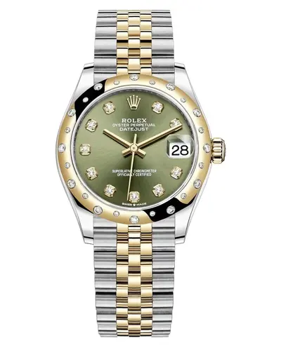 A women's luxury watch, Brand New Authentic Rolex Datejust 31. Features a Yellow Rolesor case combining Oystersteel and yellow gold with matching bracelet. Equipped with a domed fixed bezel set in diamonds. The dial is olive green featuring polished yellow gold hands and diamond hour markers; date function displayed on the dial. Powered by an automatic movement providing approximately 55 hours of power reserve. Includes second, minute, hour functions, and date display. Secured with a screw-in crown and fitted with sapphire crystal for scratch resistance. Round case measuring 31mm in diameter has a solid case back. Water resistant up to 100 meters (approximately 330 feet). Supplied with a standard 2-year manufacturer warranty.