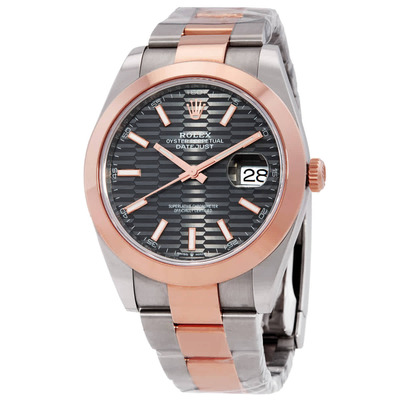 Analog watch with automatic movement. Features a stainless steel and everose gold case, fixed everose gold bezel, sapphire crystal, luminous dial markers on the slate fluted motif face (date display at 3 o'clock position), screw-down crown, folding oyster clasp, solid case back. Powered by Rolex Calibre 3235 movement with 31 jewels and a power reserve of approximately 70 hours. Water resistant to 100 meters / 330 feet.