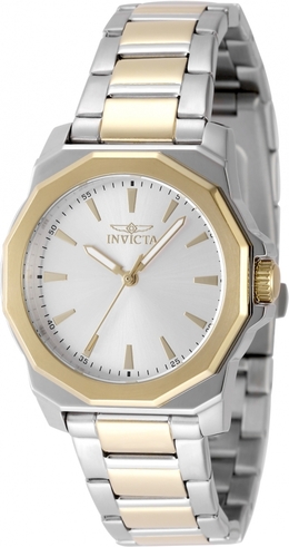 Fixed Gold-Tone Stainless Steel Bezel, Silver-Tone Analog Dial with Index Hour Markers and Luminescent Gold-Tone Hands, Two-tone Gold And Silver-Tone Stainless Steel Bracelet, Scratch Resistant Flame Fusion Crystal, TMI Caliber PC21J Japanese Quartz Movement, 30 Meter Water Resistance, Pull/Push Crown, Solid Case Back, Dodecagon Case Shape measuring 34mm Diameter and 9.2mm Thickness