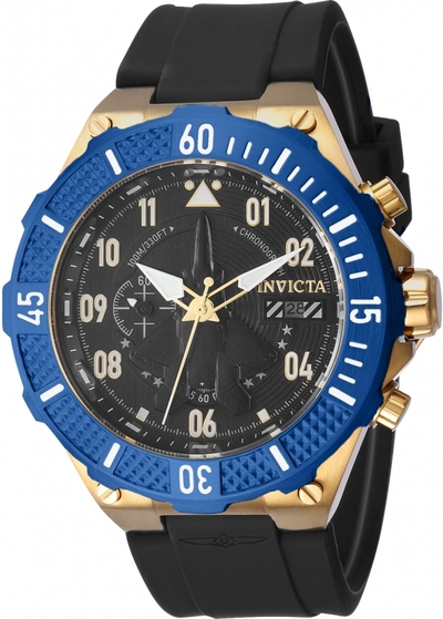 A men's sport watch from Invicta's Aviator Series featuring a black dial with gold-tone hands and Arabic numeral hour markers, minute markers around the outer rim, and luminescent coating for enhanced visibility in low light conditions.