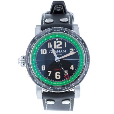 Silver-tone stainless steel case with black genuine leather strap. Black bezel with stainless steel insert and minute markers. Analog black dial featuring silver-tone hands and Arabic numeral hour markers, including luminous coating for visibility in low light conditions. Powered by automatic movement ensuring self-winding functionality. Includes transparent sapphire crystal case back allowing view of the mechanics. Classic round 44 mm case size suitable for men. Water resistant to 100 meters / 330 feet depth, making it suitable for swimming and snorkeling. Functions: GMT hand, hour hand, minute hand, second hand. Part of the esteemed Fortress City Gmt Series from Graham, designed with a luxury watch aesthetic. Watch label indicates Swiss Made origin.