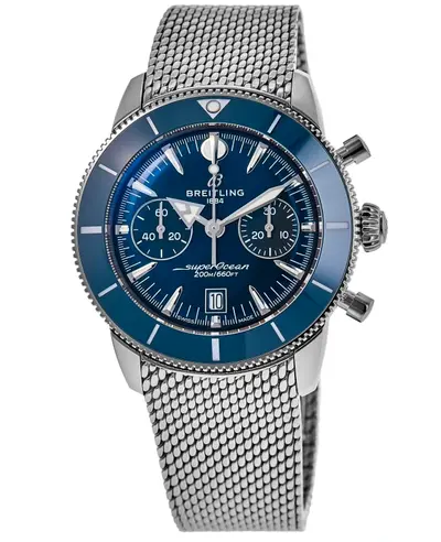 Product: Breitling Superocean Heritage B01 Chronograph 42. Brand New Authentic. Model AB0156161C1A1, also known as AB0156161C1A1d. Polished Stainless Steel case and bracelet. Deployment buckle with Push Button foldover clasp. Uni-Directional Ratcheted bezel. Blue Dial features Luminous Silver Tone Hands, Stick Hour Markers, Minute Markers around the outer rim, 2 Sub Dials (60 Second, 30 Minute) and Date at 6 o'clock. Swiss Automatic movement powered by Breitling 01 engine with 70 hours power reserve. Includes Date function at 6 o'clock. Scratch Resistant Sapphire crystal. Round case shape measuring 44mm in diameter. See-Through Case Back. Water resistant to 200 Meters / 660 Feet (approx. 60 meters/197 feet deeper than standard). Equipped with a 5-year WatchMaxx warranty.