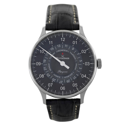 Analog automatic movement ladies watch. Silver-tone stainless steel case and fixed bezel. Black leather strap with buckle clasp. Grey dial features silver-tone hands, Arabic numeral hour markers, index markers, and minute markers around the outer rim. Transparent see through case back. Water resistant to 50 meters / 165 feet. Functions: hour, minute display.