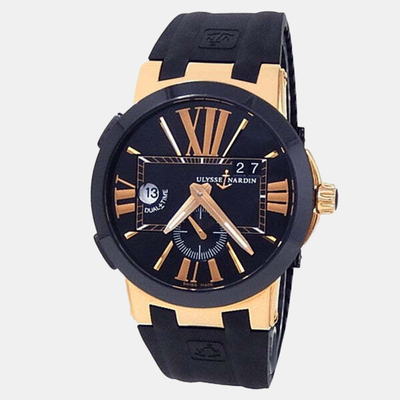 Ulysse Nardin Executive Dual Time, automatic movement. Case: 18k Rose Gold. Dial Color: Black with applied numerals and indices. Case Size: Approx. 43 mm diameter. For men. Features date display at 9 o'clock position. Two time zone indication (home and local). Standalone travel watch function.