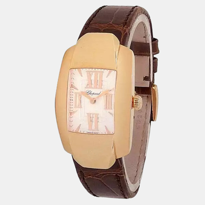 A compact and feminine Chopard wristwatch, the La Strada. Features a silver tone dial, an elegant 18k rose gold case of diameter 26 mm. Equipped with reliable quartz movement, it comes with an accompanying classic bracelet. Designed for versatility, suitable for daily wear or special events.
