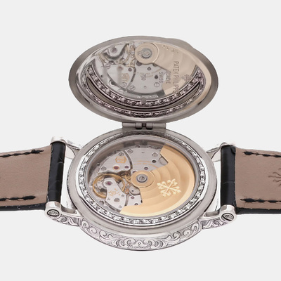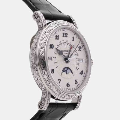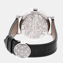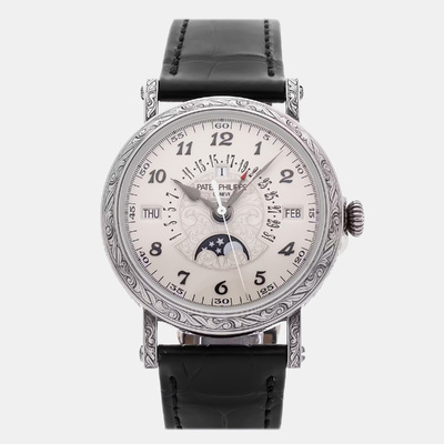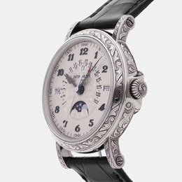 Automatic mechanical movement with perpetual calendar complication including date, month indication (including leap year), day of the week and moon phase functions accurate for 10,000 years. Features a silver dial crafted from sapphire crystal combined with white gold case material. Case diameter measures 38mm. Chronograph function with flyback complication. Tourbillon mechanism to improve accuracy at different angles. Day and night indicator (light/dark hours). 22K white gold bracelet or clasp typically included unless otherwise specified. Precision timekeeping reflecting Patek Philippe's sophisticated design and traditions of fine watchmaking.