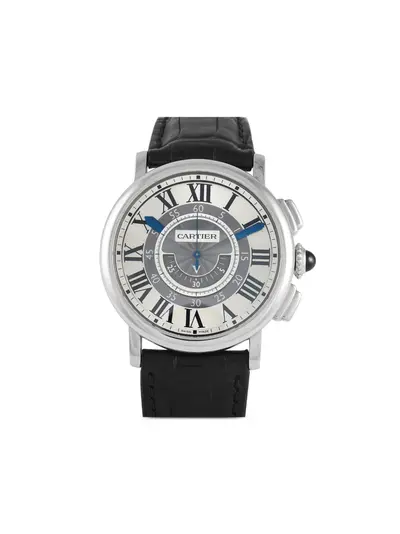 a luxury Cartier wristwatch model number 29607536. It features a round case in 18K white gold with a diameter of 42mm. The dial is finished in silver tones and displays Roman numeral hour markers on its central chronograph sub-dial. This timepiece possesses a hand-winding mechanical movement. Comes equipped with standard one-year boutique warranty. For optimal care, use specific non-abrasive jewelry cleaning products to preserve the lustre of gemstones and gold surfaces.