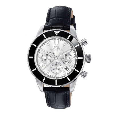 Men's luxury analog chronograph quartz watch. Silver-tone stainless steel case with black leather strap, unidirectional rotating stainless steel bezel, and silver-tone dial featuring luminous hands/index markers including minute markers around the outer rim for precise timekeeping. Date display positioned between 4 and 5 o'clock. Chronograph functions controlled by a central push/pull crown activating three sub-dials: seconds (60-second), minutes (30-minute), hours (24-hour). Powered by a reliable Miyota Caliber JS25 quartz movement ensuring accurate time with battery label indicating Japan Movt origin. Scratch resistant mineral crystal lens, solid case back, round case shape measuring 44 mm diameter and 12 mm thickness. Band width of 20 mm extends to an approximate length of 8 inches secured by buckle clasp. Water resistant capability up to 50 meters / 165 feet suitable for everyday exposure.