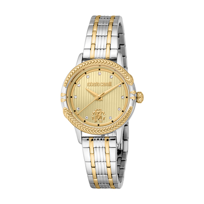Two-tone silver and yellow gold stainless steel watch with fixed yellow gold bezel, champagne dial featuring yellow gold tone hands and hour markers. Analog display driven by a quartz movement equipped with scratch resistant mineral crystal glass protected by a screw-down solid case back. Equipped with pull/push crown for setting the time and fold over clasp with safety release mechanism secured. Case size is 30mm in round shape, water resistance up to 50 meters or 165 feet. Includes functions for displaying hours, minutes, and seconds.