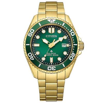 Stylish Citizen Promaster Dive watch with green dial and stainless steel case, featuring an analog display with date function. Powered by reliable Eco-Drive movement ensuring long-lasting performance without battery replacements needed. Includes scratch-resistant sapphire crystal glass for a clear view of the dial features like gold-tone hands and minute markers around the outer rim. Suitable for everyday wear and water resistant up to 200 meters.