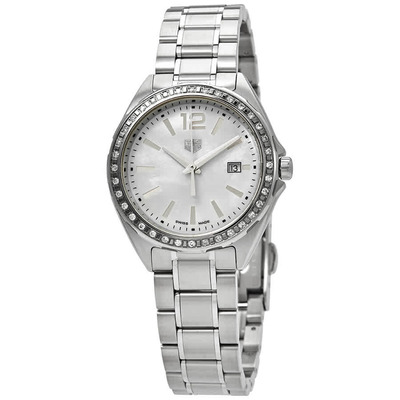 Silver-tone stainless steel case, silver-tone stainless steel bracelet with push-button fold-over clasp. Fixed bezel set with diamonds. Mother of pearl dial featuring rhodium plated hands and index-Arabic numerals at the 12 o'clock position along with outer minute markers around the rim. Analog functions display hour, minute, second and date positioned at the 3 o'clock location. Powered by quartz movement, protected by scratch-resistant sapphire crystal. Includes push-button crown operation and solid case back. Round shape measures 32 mm in width. The band has a width of 16 mm with an approximate length suitable for a 6-inch wrist. Water resistant up to 100 meters or 330 feet depth. Dress watch style, Swiss Made.