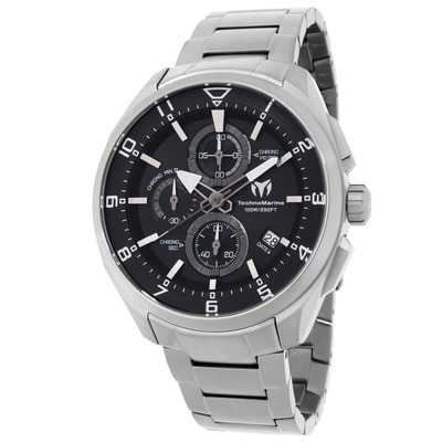 Sport watch style with black dial and silver-tone stainless steel case and bracelet. Fixed bezel also in silver-tone stainless steel. Analog display features Arabic numeral hour markers, luminous hands, and minute/second markers around the outer rim. Includes date display at the 12 o'clock position. Equipped with a chronograph function featuring three sub-dials for seconds (1/10th), minutes (60) and hours (12). Powered by Japan Movt VD57 quartz movement. Secured by fold over clasp closure. Features include scratch resistant mineral crystal, pull/push crown, solid case back. Water resistant up to 100 meters / 330 feet.