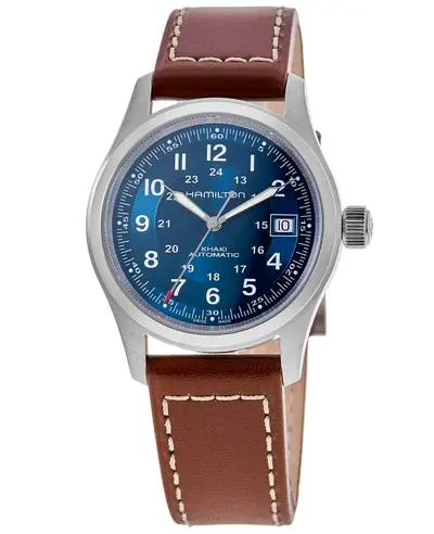 Men's Dress Watch with Stainless Steel Case and Bracelet, featuring a blue dial with luminous silver tone hands and hour markers. Includes minute markers on the outer rim and 24-hour markers on the inner bezel; date window at the three o'clock position powered by Hamilton Caliber H-10 automatic movement with an 80-hour power reserve. Case size is 38mm diameter, thickness measures 11.50mm, fixed bezel material brushed stainless steel, sapphire crystal glass for scratch resistance and clarity, polished stainless steel tang clasp bracelet finish. Water resistant up to 100 meters (approximately 330 feet). Comes with a standard 2-year WatchMaxx warranty.