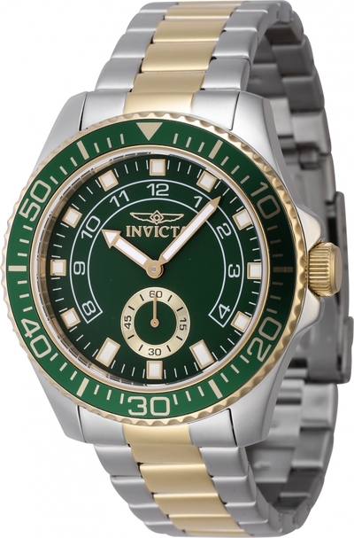 Silver-tone stainless steel case, two-tone stainless steel bracelet (gold and silver-tone). Fixed green aluminum bezel. Analog green dial with gold-tone hands and index hour markers; minute markers around outer rim. Includes small second subdial. Luminescent accents on hands and markers. Flame Fusion scratch resistant crystal. Pull/push crown operation. Solid case back. Round 44 mm diameter, 11.00 mm thick case. 22 mm band width adjustable to approx 7.25 inches length with fold over safety clasp. TMI Caliber VD78 quartz movement from Japan. Water resistant up to 50 meters or 165 feet.