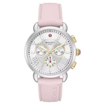 Women's sport chronograph watch with white dial featuring gold-tone hands and index-Roman numeral markers. Equipped with three sub-dials for 60-second, 30-minute, and tenths-of-a-minute timers. Powered by a quartz movement, it has an analog display, date function at the 6 o'clock position, silver-toned stainless steel case, pink silicone strap, fixed bezel, scratch-resistant K1 crystal, pull/push crown, solid case back, round shape measuring 38 mm with an 18-mm band width, and is water resistant up to 50 meters (165 feet).