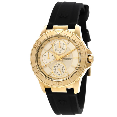 Gold-tone stainless steel case, black silicone strap with fixed bezel. Analog gold-tone dial featuring luminous hands and markers, index hour gold-tone markers, minute outer rim markers, date display at 12 o'clock position, three sub-dials for day, date and second time zone/24hr function indicators. TMI Caliber VH67 quartz movement manufactured in Japan. Scratch resistant mineral crystal. Pull/push crown operation. Solid case back. Round shape measuring 36 mm diameter with thickness of 10.3 mm. Band width is 18 mm, length approximately 7.25 inches (adjustable). Secured by a buckle clasp. Water resistant up to 100 meters / 330 feet.