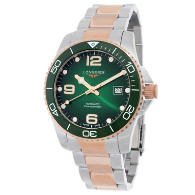 Automatic movement with 72-hour power reserve. Two-tone (silver and rose gold) stainless steel case and bracelet. Rose gold-toned bezel band with green insert. Green dial featuring rose gold-toned hands and index-Arabic numeral hour markers, including minute markers on the outer rim. Luminescent coating applied to hands and markers for enhanced visibility in low light conditions. Date display positioned at the 12 o'clock location. Sapphire crystal glass provides scratch resistance and clarity. Secured by a push/pull crown system. Classic round case shape measures 41 mm diameter with a thickness of 11.90 mm. Equipped with a folding clasp that includes a safety release mechanism for secure fastening. Water resistant to depths of up to 300 meters (approximately 1000 feet). Analog dial type displaying hours, minutes and seconds. Functions include timekeeping and date display.