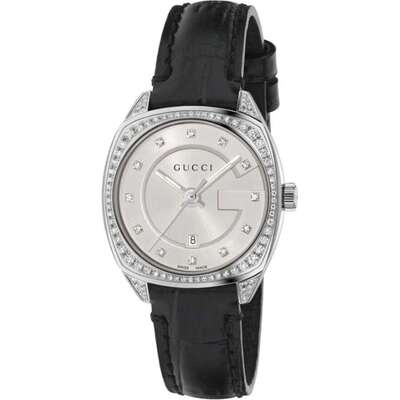 Silver-tone stainless steel case with black leather strap, fixed silver-tone bezel. Features a silver-tone dial marked with diamonds and silver-tone hands displaying the date at 6 o'clock position via analog quartz movement. Solid case back, cushion shape (approx. 29mm diameter). Water resistant to 50 meters / 165 feet. Functions include hour, minute, second indication and date display.