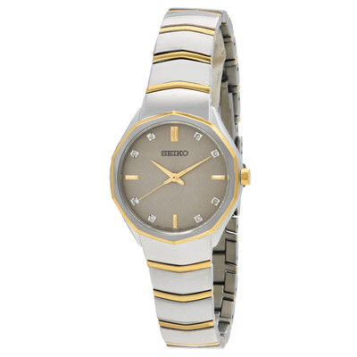 Silver-tone stainless steel case with two-tone (silver and rose gold) stainless steel bracelet. Features a fixed stainless steel bezel, grey dial marked with gold-tone hour indices and hands, analog display driven by Seiko Caliber 6N01 quartz movement. Equipped with scratch-resistant sapphire crystal glass, a push/pull crown for setting the time, and a solid case back. This ladies' casual watch boasts a round 29.6 mm size, fold-over clasp with safety release mechanism, water resistance to 50 meters (approx. 165 ft), and standard hour, minute, second functions.