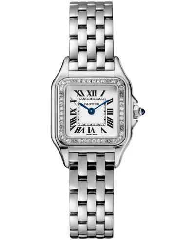 A women’s Cartier Panthere de Cartier watch, presented in a compact size. Features include a silver dial enhanced with diamond accents around the bezel and an elegant stainless steel band completing its sophisticated appearance.