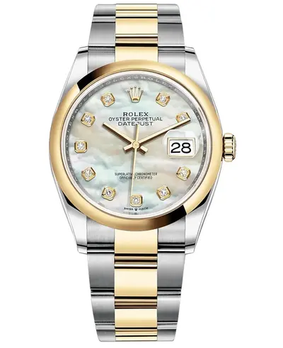 New Authentic Rolex Datejust 36mm. Yellow Gold and Steel case, Mother of Pearl Diamond Dial, Oyster band with Polished clasp. Automatic Chronometer movement Calibre 3235. Features: Date Function at 3 o'clock, Hour/Minute/Second display, Screw-in Crown, Scratch Resistant Sapphire Crystal, Water resistant to 100 meters (approx. 330 feet). Includes original warranty.