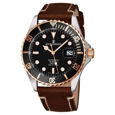 Stainless steel case with a brown leather strap. Unidirectional rotating rose gold-tone bezel with an inlaid black ring. Black dial with luminous rose gold-tone hands and dot hour markers. Minute markers around the outer rim. Dial Type: Analog. Luminescent hands and markers. Date display at the 3 o'clock position. Automatic movement. Scratch resistant sapphire crystal. Screw down crown. Solid case back. Round case shape. Case size: 42 mm. Case thickness: 12 mm. Band width: 21 mm. Band length: 8 inches. Tang clasp. Water resistant at 300 meters / 1000 feet. Functions: date, hour, minute, second. Diver Xl Series. Casual watch style. Watch label: Swiss Made. Revue Thommen Diver XL Automatic Black Dial Mens Watch 17571.2557.