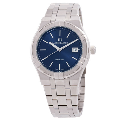 Silver-tone stainless steel case, fixed silver-tone bezel. Blue dial features silver-tone hands and index hour markers with minute markers around the outer rim; analog display type. Date window at 3 o'clock. Luminescent coating on hands and markers for enhanced legibility in low light conditions. Powered by a quartz movement mechanism ensuring precise timekeeping. Protected scratch-resistant sapphire crystal lens offers excellent durability against impacts and abrasion. Classic round case measuring 40 mm in diameter. Equipped with a fold over clasp that includes a safety release feature to prevent accidental opening. Water resistant up to 100 meters or 330 feet, suitable for recreational swimming but not scuba diving.