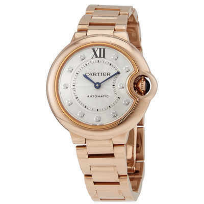 We902062 Pre-owned Cartier watch with 18kt rose gold case and bracelet, fixed bezel. Silver dial features blued-steel sword-shaped hands, diamond hour markers including a Roman numeral at the 12 o'clock position, minute markers on an inner ring. Analog functions display hours and minutes only. Equipped with Cartier calibre 076 automatic movement based on ETA 2670 (25 jewels, 28800 vph), approximately 38-hour power reserve. Scratch-resistant sapphire crystal, cabochon crown, solid case back. Round case size: 33 mm, thickness: 9.96 mm. Deployment clasp closure. Water resistant to 30 meters / 100 feet.
