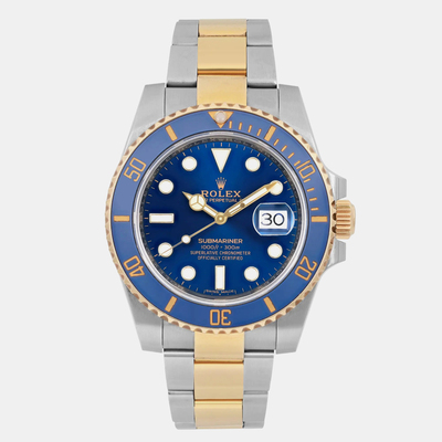 Automatic movement. Blue dial with luminescent markers and bezel insert. Case size 40mm combining yellow gold and stainless steel materials including a solid 18K yellow gold case middle link and fluted bezel set in stainless steel links. Stainless steel bracelet. Date display at 3 o'clock aperture. Water resistant to 100 meters.