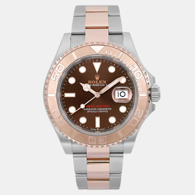 A refined nautical aesthetic is presented by this strikingly elegant Rolex Yacht Master wristwatch. Features an automatic movement, a chocolate dial with rich color, bi-metallic construction combining stainless steel and 18K Everose gold case elements, measuring 40 mm in diameter for the men's model.