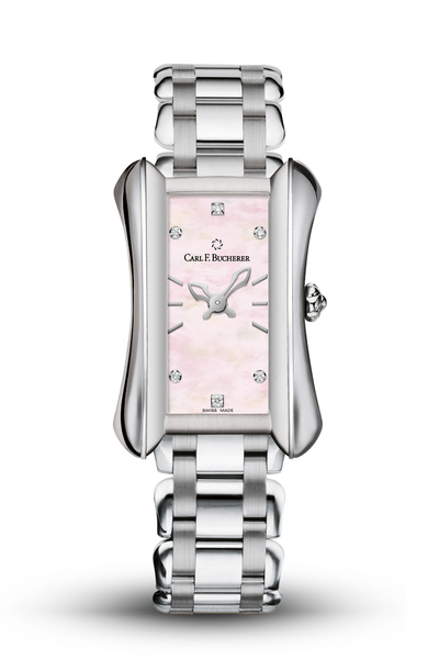 Silver-tone stainless steel case and bracelet. Fixed silver-tone stainless steel bezel. Pink mother of pearl dial with silver-tone hands, index-set diamonds hour markers. Analog dial type driven by Carl F. Bucherer Calibre CFB 1850 quartz movement. Scratch resistant sapphire crystal. Solid case back. Unique ladies' watch shape measuring 26.5x38 mm. Equipped with a folding clasp closure system. Water resistant up to 30 meters / 100 feet depth, suitable for shallow splashes or hand washing. Features hour and minute indications only.