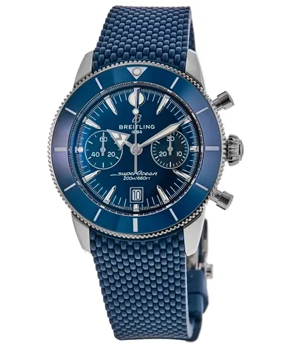 Authentic Breitling Superocean Heritage B01 Chronograph. Polished stainless steel case, sapphire crystal, polished stainless steel folding clasp, screw down crown. Features a blue dial with luminous silver tone stick hour and minute markers including Minute and 30-Minute sub-dials plus date display at the six o'clock position. Equipped with Swiss Automatic movement powered by Breitling 01 engine chronograph mechanism water resistant to 200 meters scratch resistant sapphire crystal round case shape measuring 42mm in diameter see-through case back.