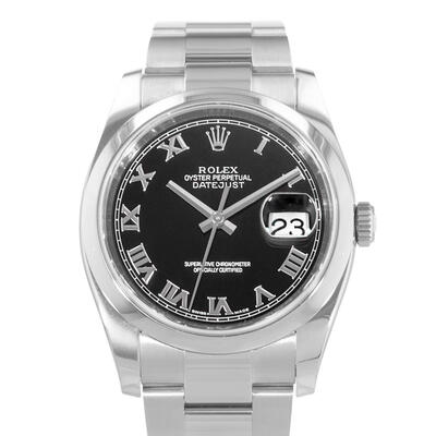 Silver-tone stainless steel case with silver-tone stainless steel oyster bracelet and fixed bezel. Black analog dial featuring Roman numeral hour markers, minute markers at the outer rim, and silver-tone hands. Equipped with a Rolex Calibre 3135 automatic chronometer movement containing 31 jewels, beating at 28800 vph (4 Hz), offering approximately 48 hours of power reserve. Includes date display at the 3 o'clock position and screw-down crown. Solid case back. Round shape in size BKRO-72600: 36 mm. Features fold over clasp with safety release, scratch-resistant sapphire crystal, and water resistance up to 100 meters (approx. 330 feet). Style is luxury menswear; Swiss Made.