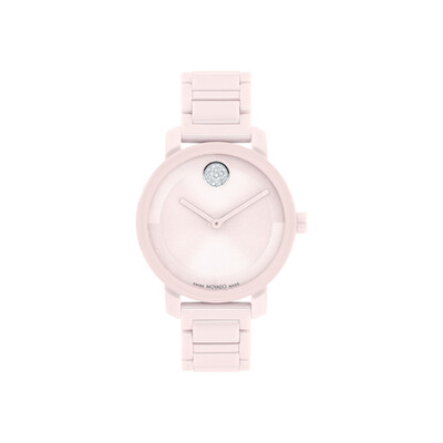 Pink ceramic case and bracelet combination creates a sophisticated look. Fixed pink ceramic bezel adds to the elegant design. Analog quartz movement provides accurate timekeeping. The round case measures 34 mm in diameter, suitable for women's wrists. Pink dial features pink hour and minute hands. Solid case back offers durability. Includes fold over clasp with safety release mechanism. Water resistant up to 100 feet (approximately 30 meters). Basic functions display hours and minutes.
